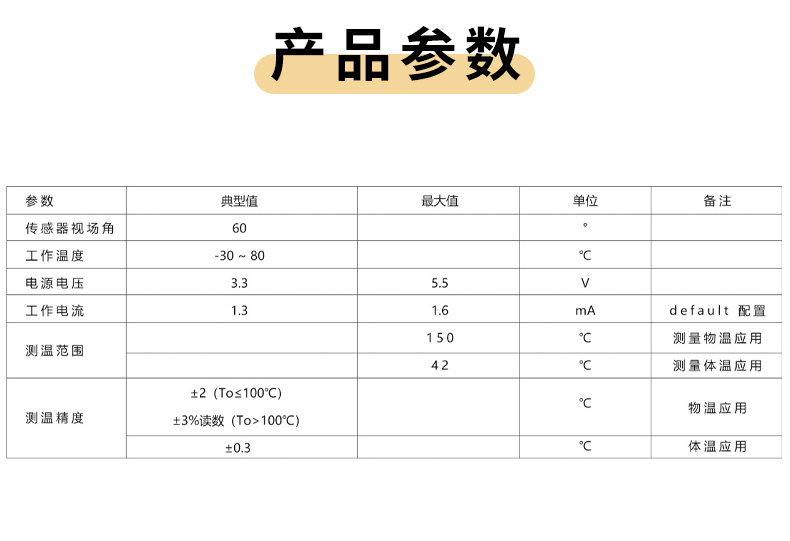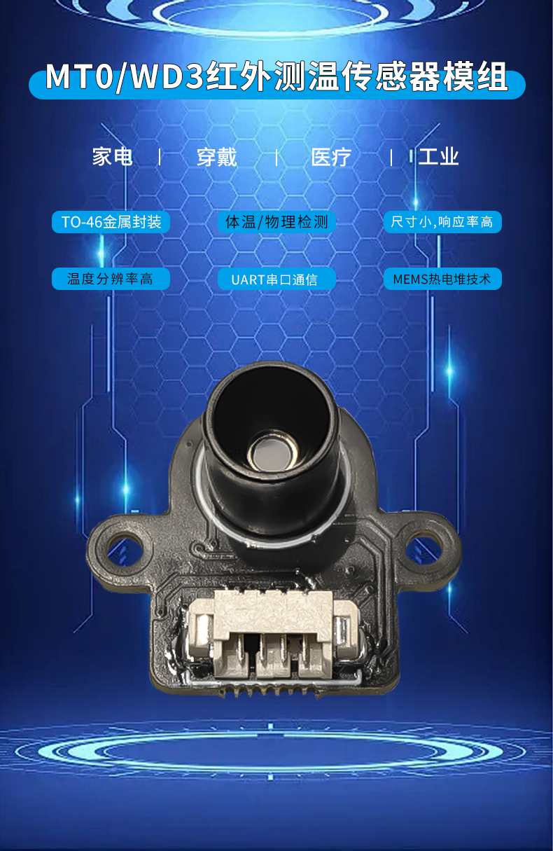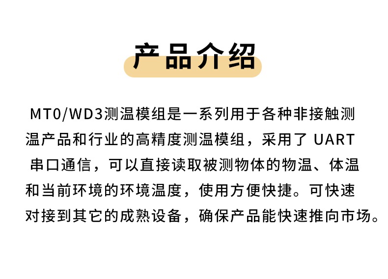 产品描述:MTO/WD3测温模组是一系列用于各种非接触测温产品和行业的高精度测温模组,采用了UART 串口通信,可以直接读取被测物体的物温、体温和当前环境的环境温度,使用方便快捷。可快速对接到其它的成熟设备,确保产品能快速推向市场。