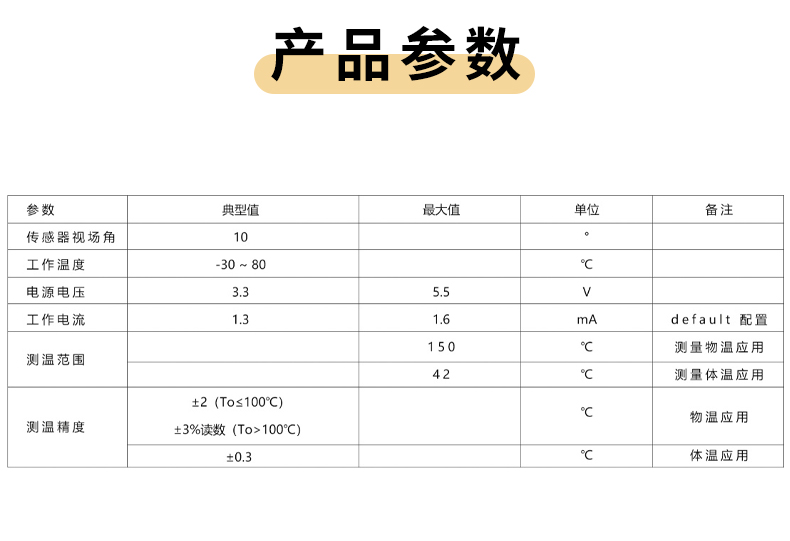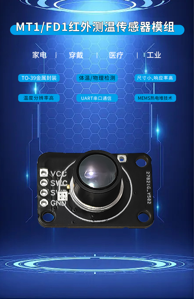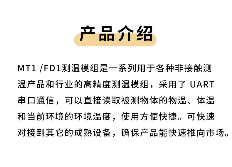 产品描述:MT1-FD1测温模组是一系列用于各种非接触测温产品和行业的高精度测温模组,采用了UART 串口通信,可以直接读取被测物体的物温、体温和当前环境的环境温度,使用方便快捷。可快速对接到其它的成熟设备,确保产品能快速推向市场。