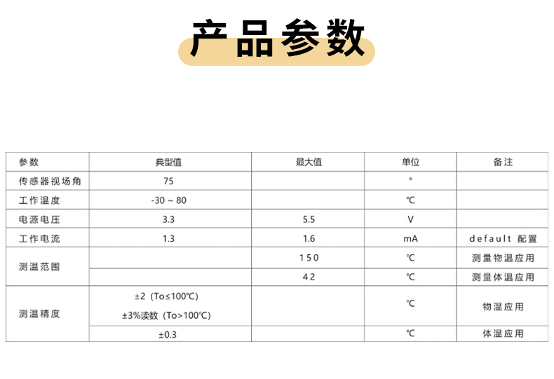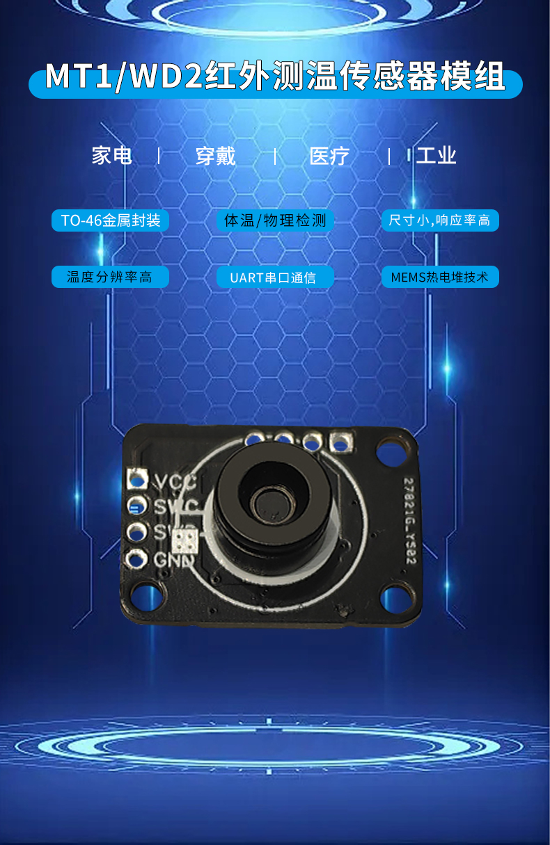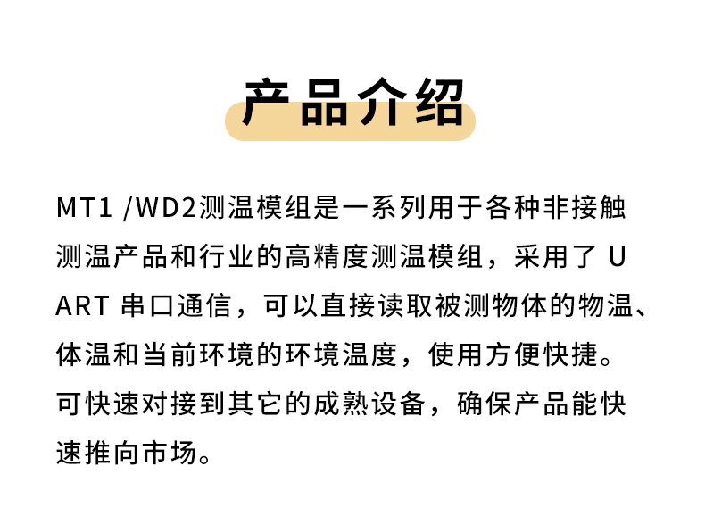 产品描述:MT1/WD2测温模组是一系列用于各种非接触测温产品和行业的高精度测温模组,采用了UART 串口通信,可以直接读取被测物体的物温、体温和当前环境的环境温度,使用方便快捷。可快速对接到其它的成熟设备,确保产品能快速推向市场。