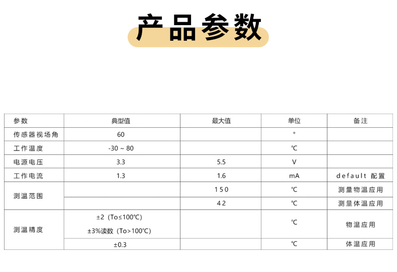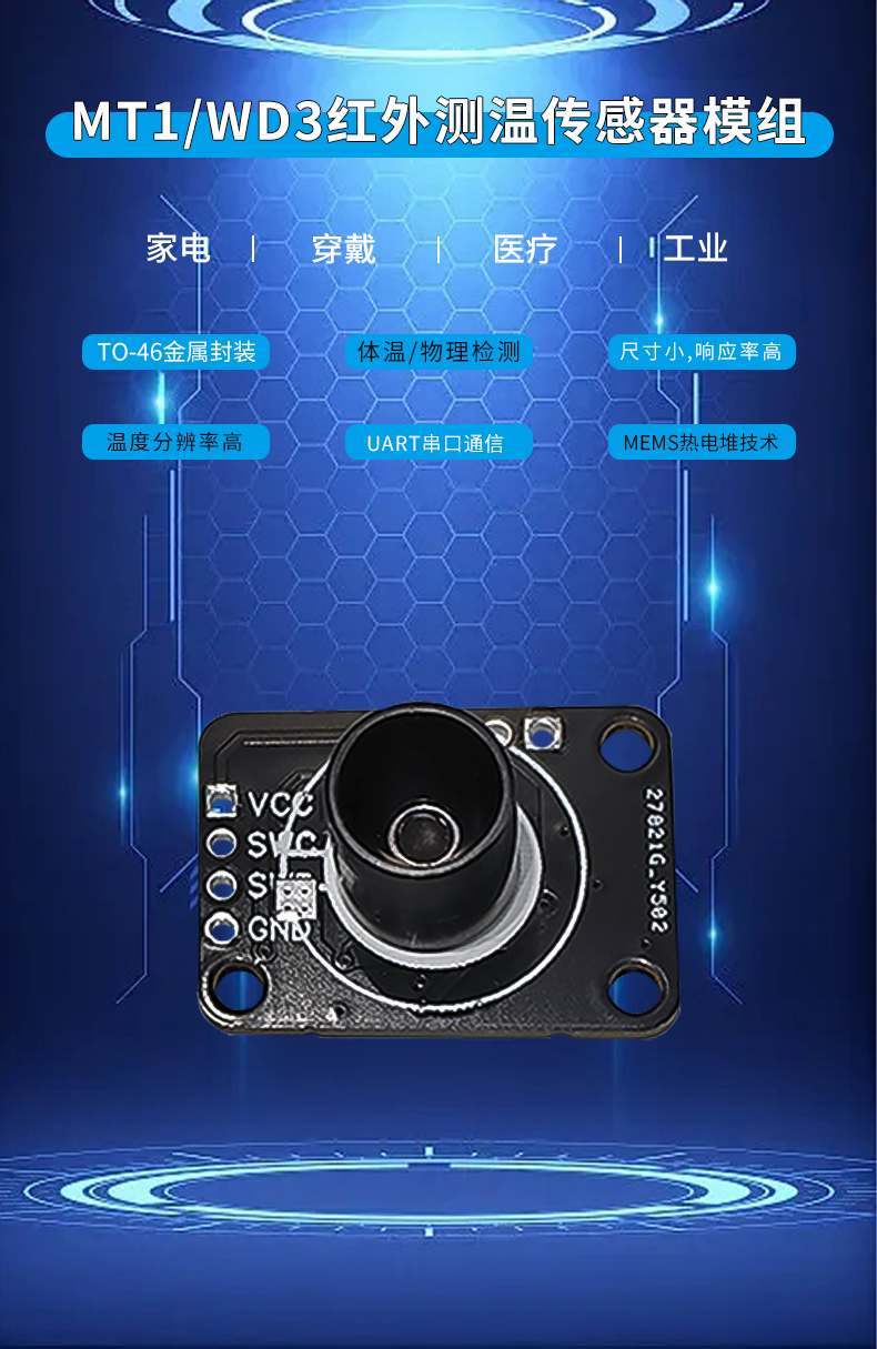 产品描述:MT1-WD3测温模组是一系列用于各种非接触测温产品和行业的高精度测温模组,采用了UART 串口通信,可以直接读取被测物体的物温、体温和当前环境的环境温度,使用方便快捷。可快速对接到其它的成熟设备,确保产品能快速推向市场。