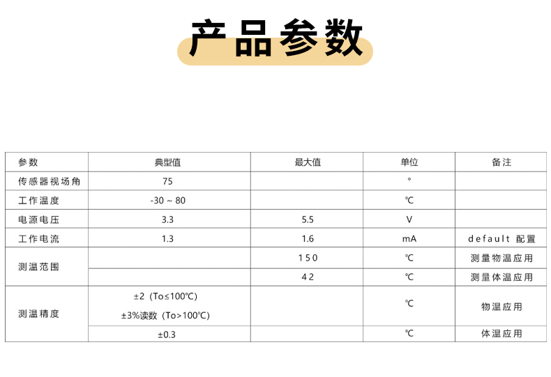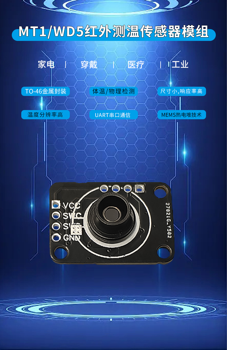 产品描述:MT1-WD5测温模组是一系列用于各种非接触测温产品和行业的高精度测温模组,采用了UART 串口通信,可以直接读取被测物体的物温、体温和当前环境的环境温度,使用方便快捷。可快速对接到其它的成熟设备,确保产品能快速推向市场。