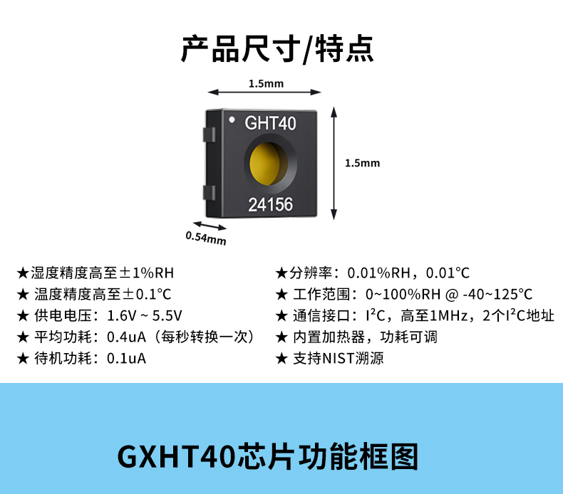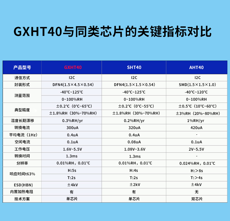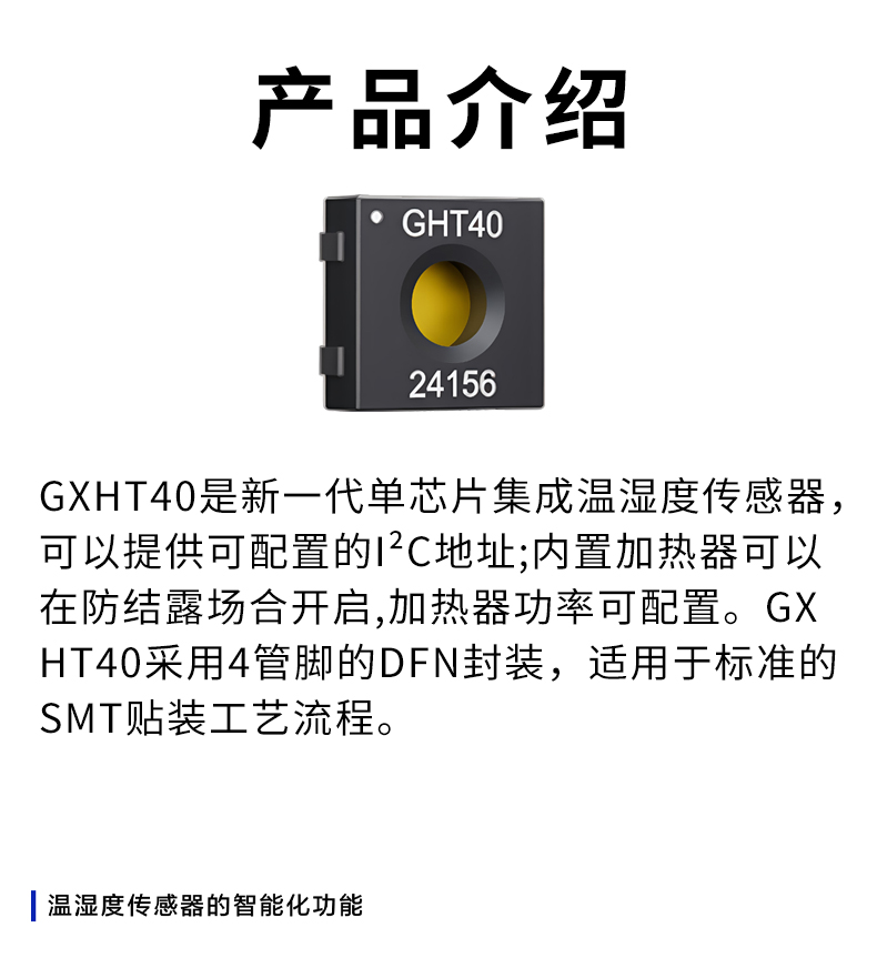 GXHT40是新一代单芯片集成温湿度传感器可以提供可配置的I2C地址;内置加热器可以在防结露场合开启,加热器功率可配置。