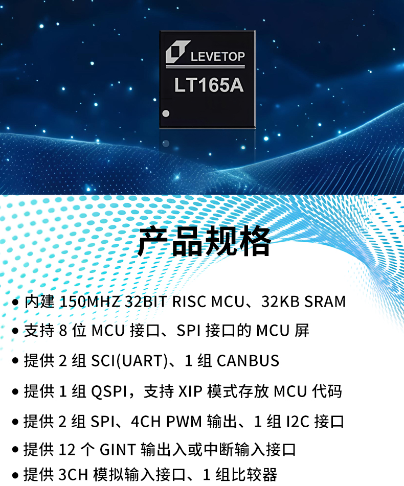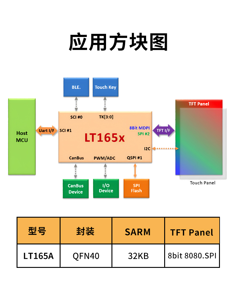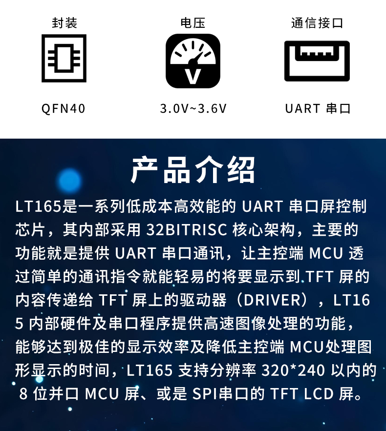 产品描述:LT165是一系列低成本高效能的 UART 串口屏控制芯片,其内部采用 32BITRISC核心架构,主要的功能就是提供 UART 串口通讯,让主控端 MCU 透过简单的通讯指令就能轻易的将要显示到.TFT 屏的内容传递给TFT屏上的驱动器(DRIVER)。LT165 内部硬件及串口程序提供高速图像处理的功能能够达到极佳的显示效率及降低主控端 MCU处理图形显示的时间,LT165 支持分辨率 320*240 以内的8 位并口 MCU 屏、或是 SPI串囗的 TFT LCD 屏。