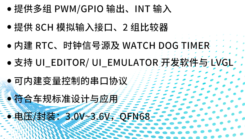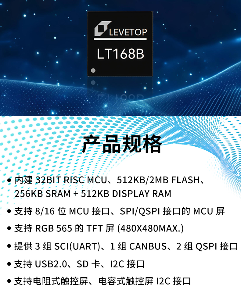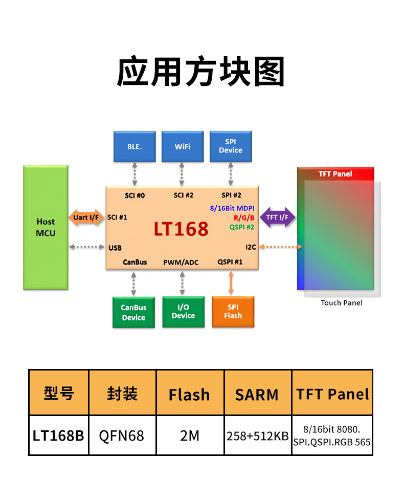 产品描述:LT168-A是高效能的 UART 串口屏控制芯片,其内部采用 32BIT RISC 核心架构,主要的功能就是提供 UART 串口通讯,让主控端 MCU 透过简单的通讯指令就能轻易的将要显示到TFT 屏的内容传递给 TFT 屏上的驱动 器(DRIVER)。LT168-A 内部硬件及串口程序提供高速图像处理的功能,能够达到极佳的显示效率及降低主控端 MCU 处理图形显示的时间,LT168-A支持分辨率 800*480 以内的8 位/16 位并口MCU 屏、或是SPI/OSPI 串曰的MCU 屏。