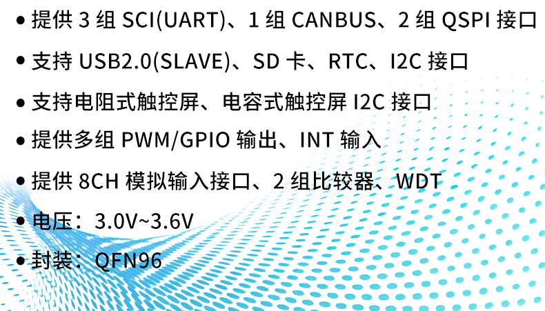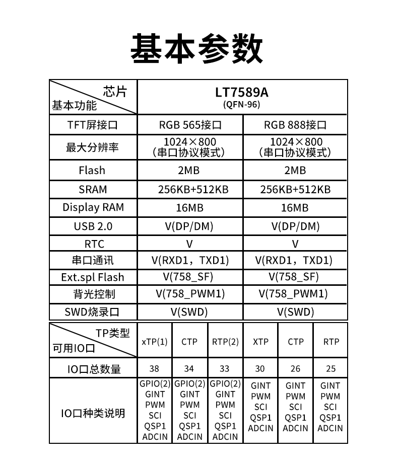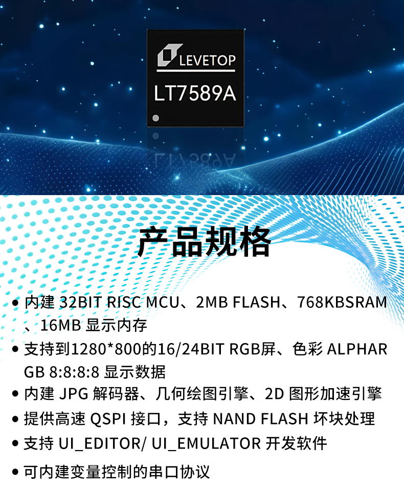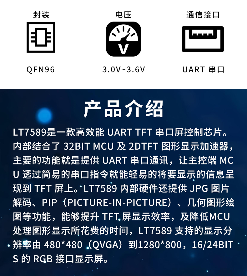 产品描述:LT7589是一款高效能 UART TFT 串口屏控制芯片。内部结合了 32BIT MCU 及 2DTFT 图形显示加速器主要的功能就是提供 UART 串口通讯,让主控端 MOU 透过简易的串口指令就能轻易的将要显示的信息呈现到 TFT 屏上。LT7589 内部硬件还提供 JPG 图片解码PIP(PICTURE-IN-PICTURE)、几何图形绘图等功能,能够提升 TFT屏显示效率,及降低MCU处理图形显示所花费的时间,LT7589 支持的显示分辨率由 480*480(OVGA)到1280*800,16/24BITS 的 RGB 接口显示屏。