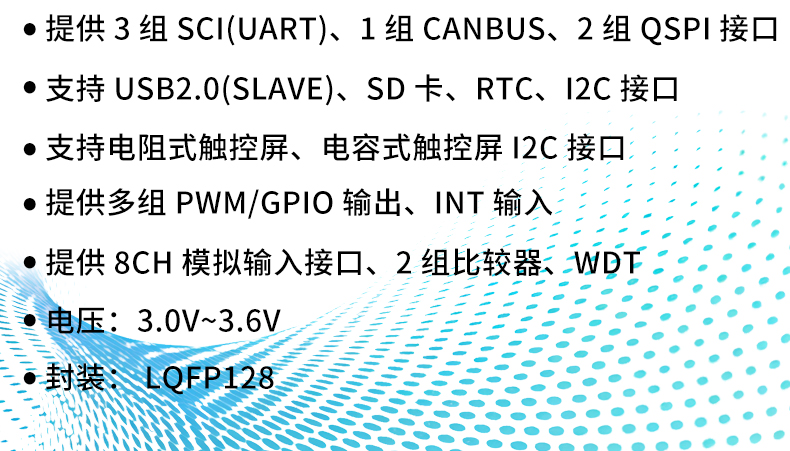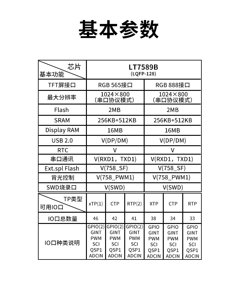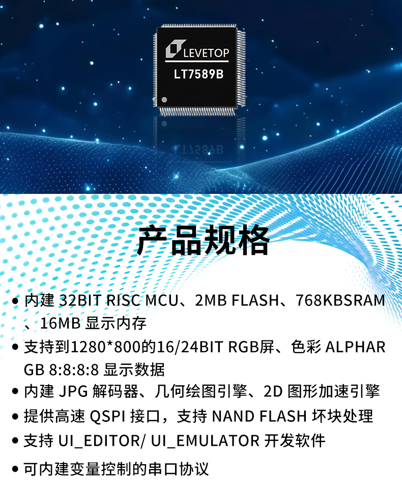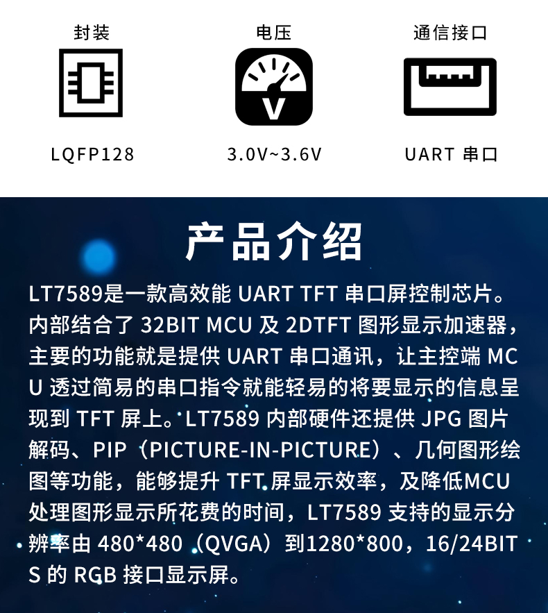产品描述:LT7589是一款高效能 UART TFT 串囗屏控制芯片。内部结合了 32BIT MCU 及 2DTFT 图形显示加速器主要的功能就是提供 UART 串口通讯,让主控端 MOU 透过简易的串口指令就能轻易的将要显示的信息呈现到 TFT 屏上。LT7589 内部硬件还提供 JPG 图片解码、PIP(PICTURE-IN-PICTURE)、几何图形绘图等功能,能够提升 TFT屏显示效率,及降低MCU处理图形显示所花费的时间,LT7589 支持的显示分辨率由 480*480.OVGA):到1280*800,16/24BITS 的 RGB 接口显示屏。