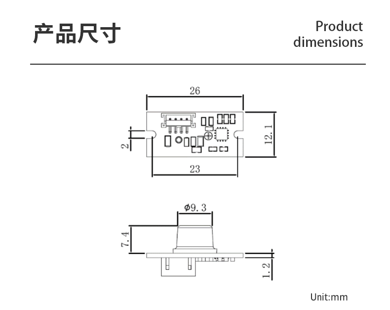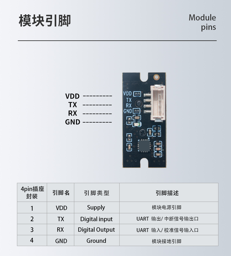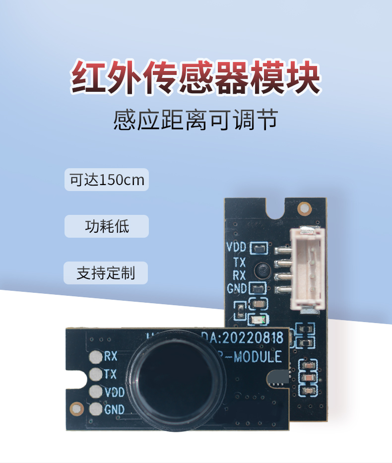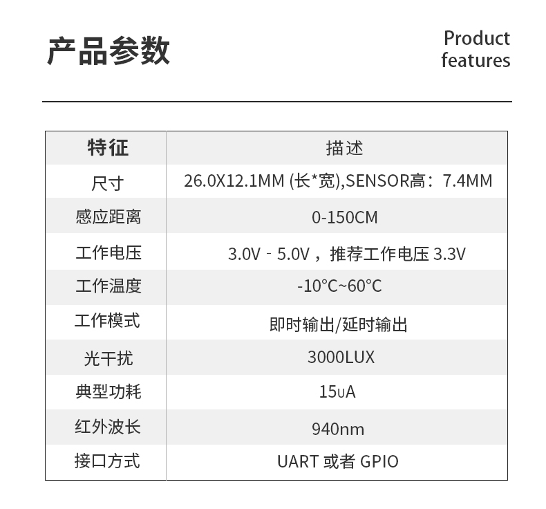1: 主动式红外发射器件(940nm),高灵敏度 红外接收器件 2: 接近感应范围宽,可编程最远感应距离 3750px。 3:接口:使用 UART 串口通讯配置,配置模 块 4: 低功耗:15uA 5: 小尺寸,易装配。 6: 抗光噪声能力强,可用于室外环境。