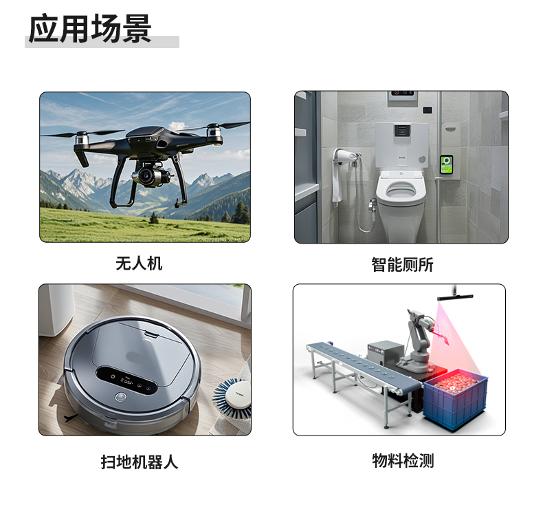 激光测距适合各类智能居家电子产品使用,如智 能灯具、机器人避障、投影仪、商显等。提供 IIC 输出模式供用户选择,可快速调整各项模块特性。模块化设计,拥有快速且便利的开发优势,可有效缩短产品开发周期。