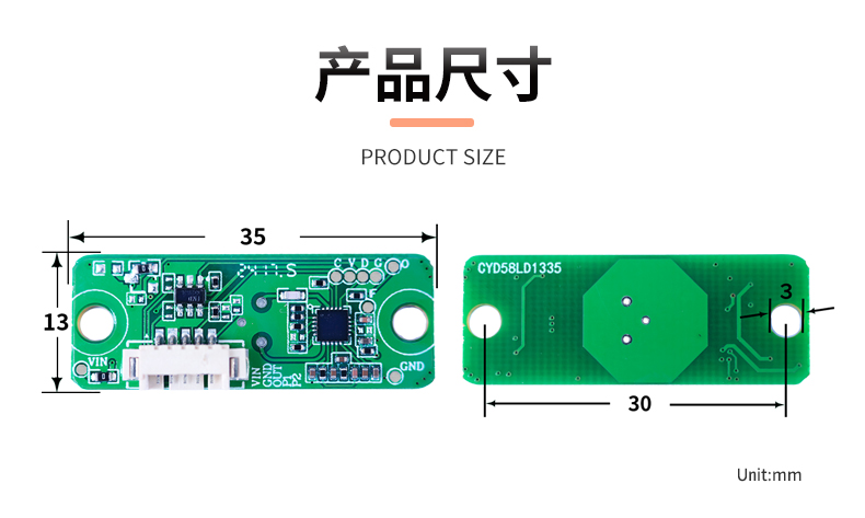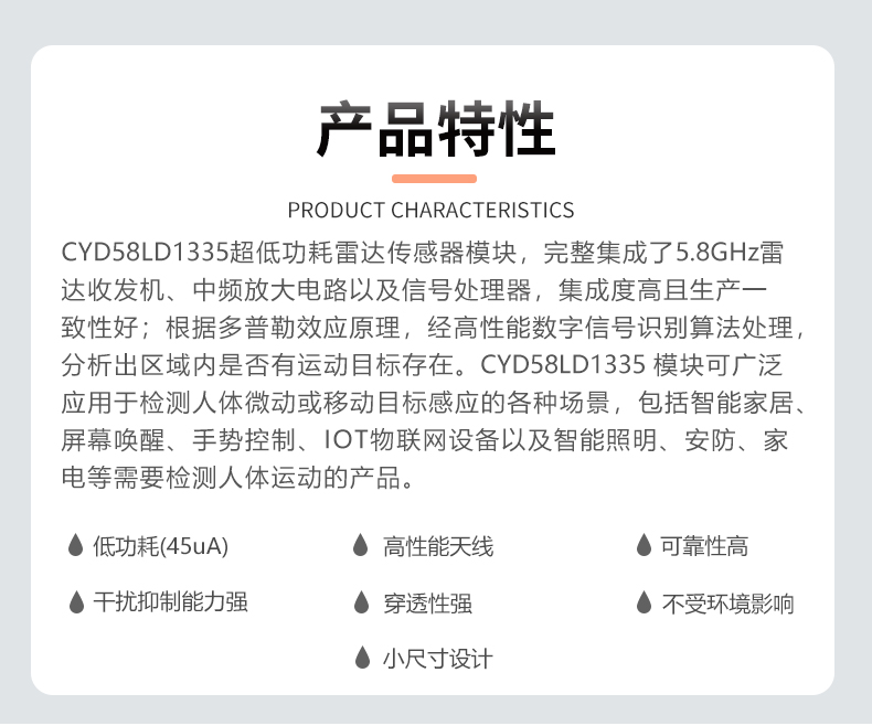 产品描述:该微波感应雷达模组该是芯亿达自主研发的小型化、微安级超低功耗的5.8G雷达传感器模组。通过雷达工作原理,实现对运动和微动的场景感知,落地应用于多种场景应用的智能化判断,助力打造智能空间。