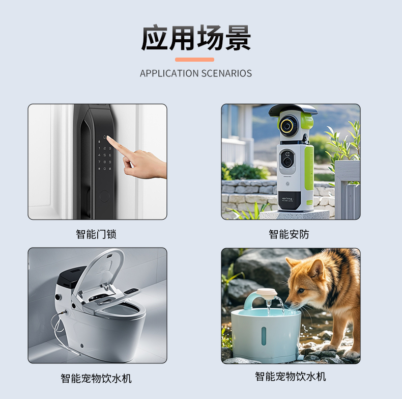 它聚焦智慧安防/智能门锁/智能宠物饮水机/智能捕鼠器领域的应用,如各种类型的智能门锁,其他领域的应用可拓展。