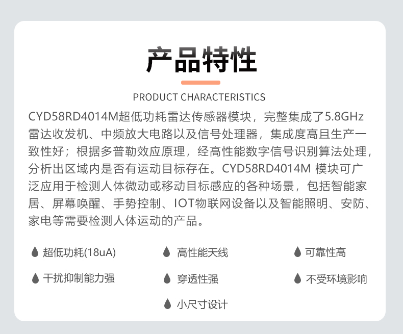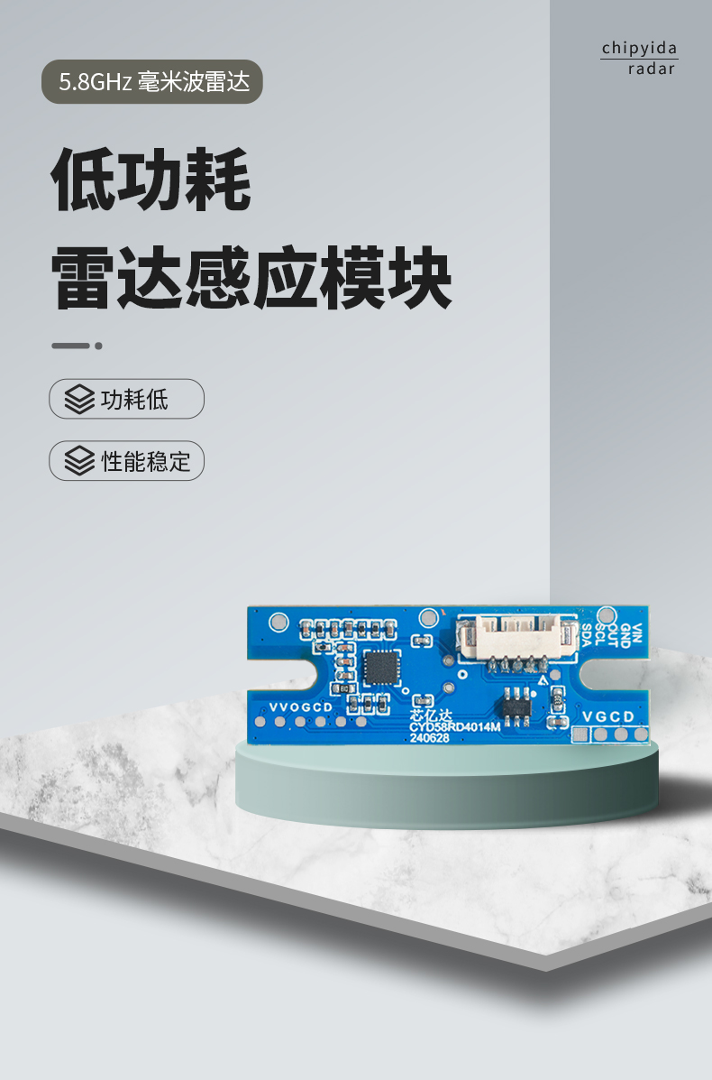 该微波感应雷达模组该是芯亿达自主研发的小型化、微安级超低功耗的5.8G雷达传感器模组。通过雷达工作原理,实现对运动和微动的场景感知,落地应用于多种场景应用的智能化判断,助力打造智能空间。