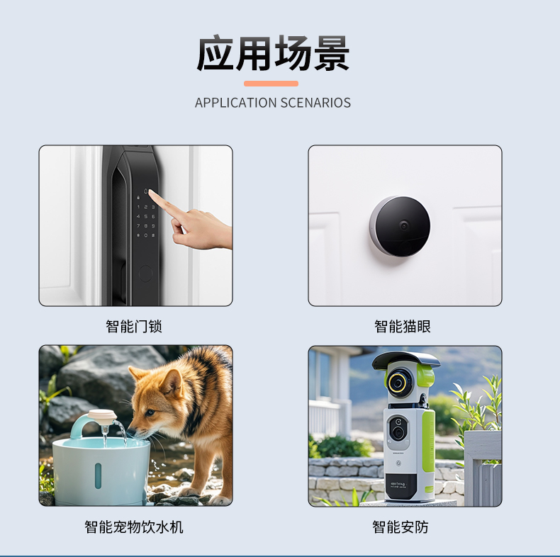 它聚焦智慧安防/智能门锁/智能宠物饮水机/智能捕鼠器领域的应用,如各种类型的智能门锁,其他领域的应用可拓展。