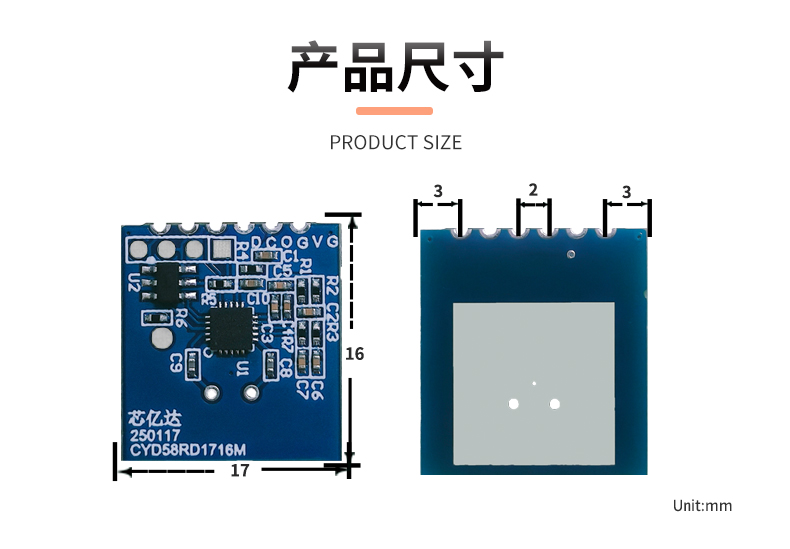 该微波感应雷达模组该是芯亿达自主研发的小型化、微安级超低功耗的5.8G雷达传感器模组。通过雷达工作原理,实现对运动和微动的场景感知,落地应用于多种场景应用的智能化判断,助力打造智能空间。
