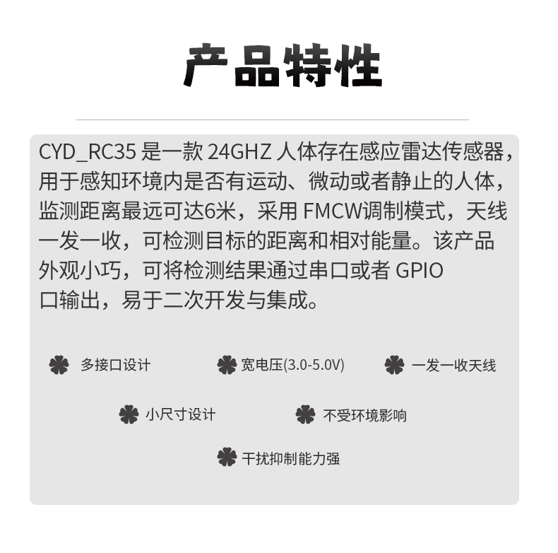 该微波感应雷达模组该是芯亿达自主研发的小型化、微安级超低功耗的24G雷达传感器模组。通过雷达工作原理,实现对运动和微动的场景感知,落地应用于多种场景应用的智能化判断,助力打造智能空间。