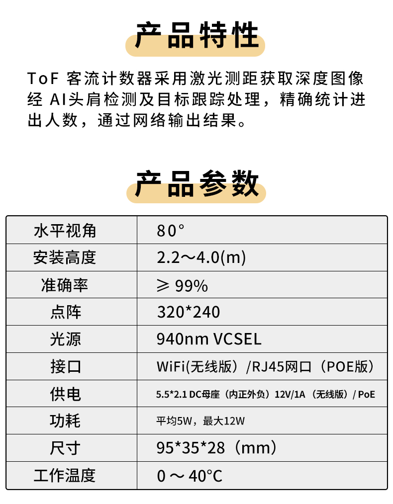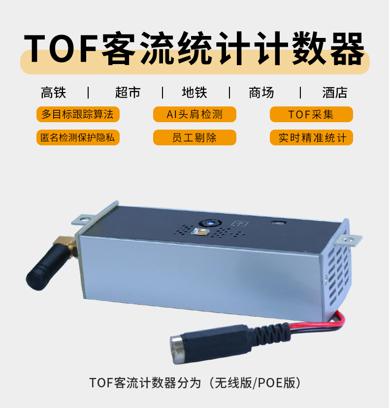 ToF 客流计数器采用激光测距获取深度图像,经 AI头肩检测及目标跟踪处理,精确统计进出人数,通过网络输出结果。