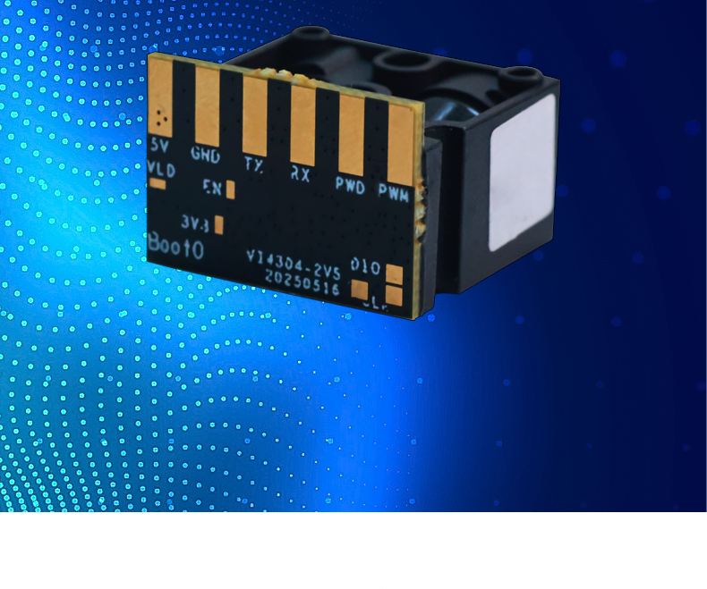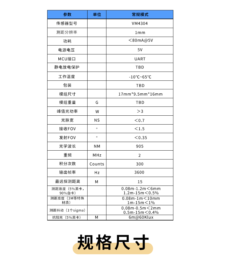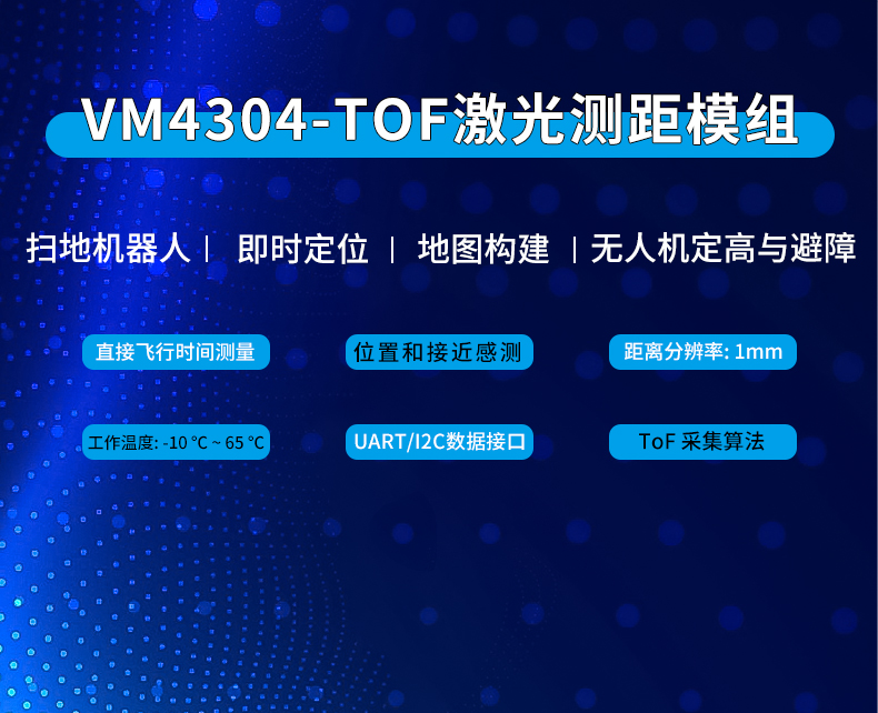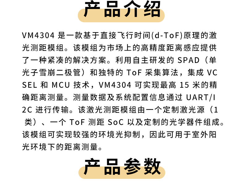 产品描述:VM4304 是一款基于直接飞行时间(d-ToF)原理的激光测距模组。该模组为市场上的高精度距离感应提供了一种紧凑的解决方案。利用自主研发的 SPAD(单光子雪崩二极管)和独特的 ToF 采集算法,集成 VCSEL 和 MCU 技术,VM4304 可实现最高 15 米的精确距离测量。测量数据及系统配置信息通过 UART/I2C 进行传输。