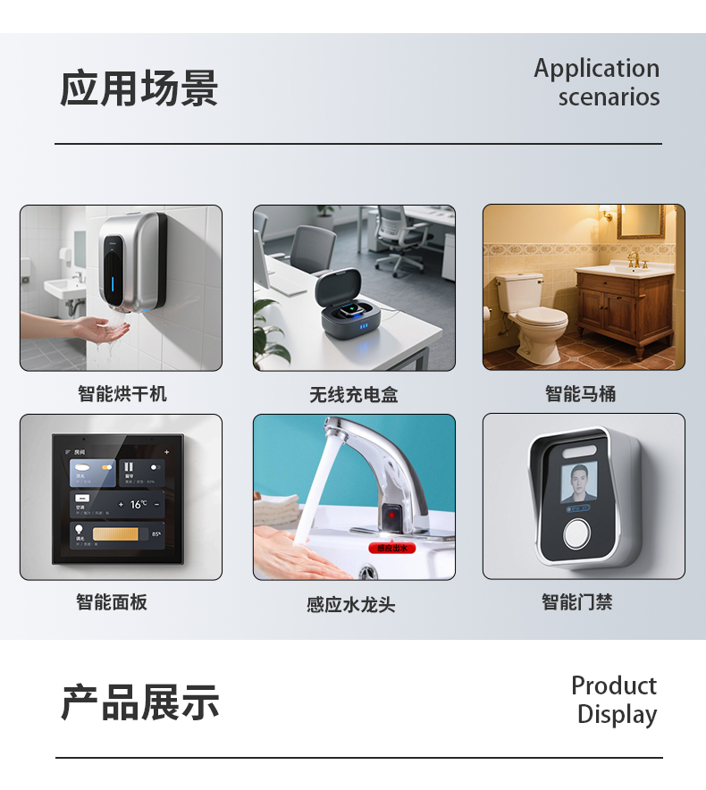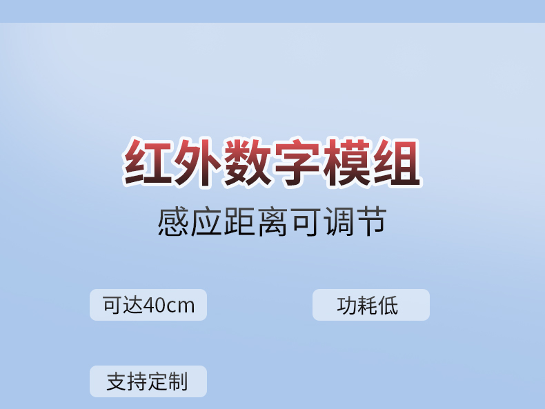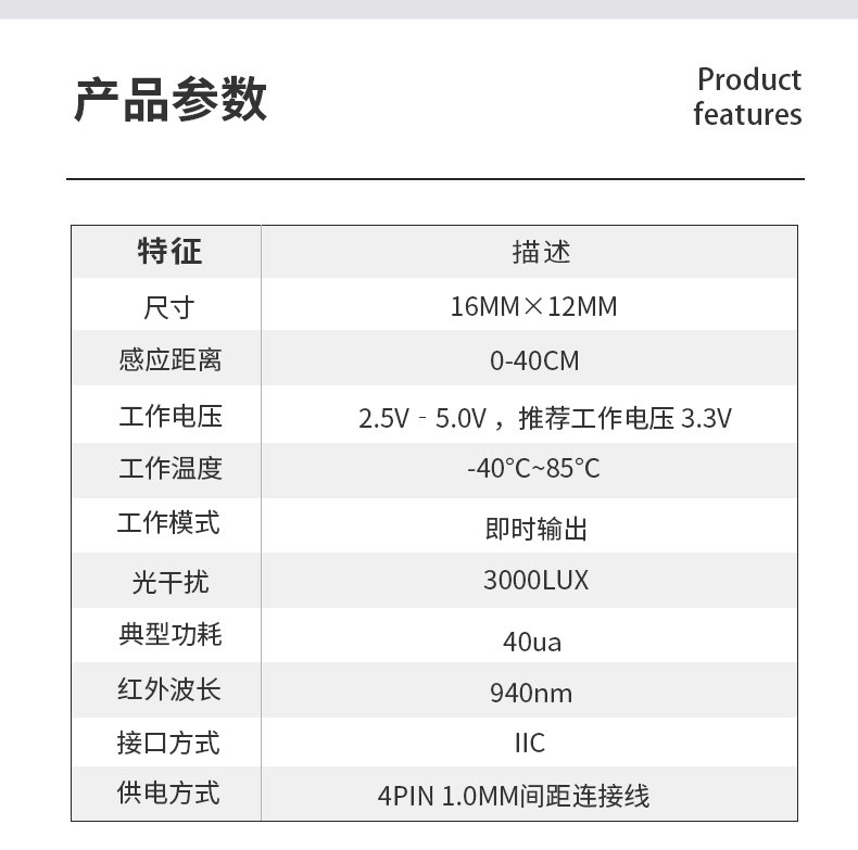 相较于市面上一般红外感应模块,此 模块不仅体积小,支持物体短距离侦测 1-750px,且拥有 1.5mA@3.3V 待机功耗,满足不同电源设计产品应 用需求。接近感应侦测适合各类智能居家电子产品使用,如智能门锁、智能化妆镜、智能洁具、自动烘干机的接近感应。